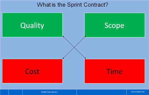 Scope: The implementation team agrees to do its best to deliver an agreed on set of features (scope) to a defined quality standard by the end of the sprint. (Ideally they deliver what they promised, or even a bit more.) The Product Owner agrees not to change his instructions before the end of the Sprint.