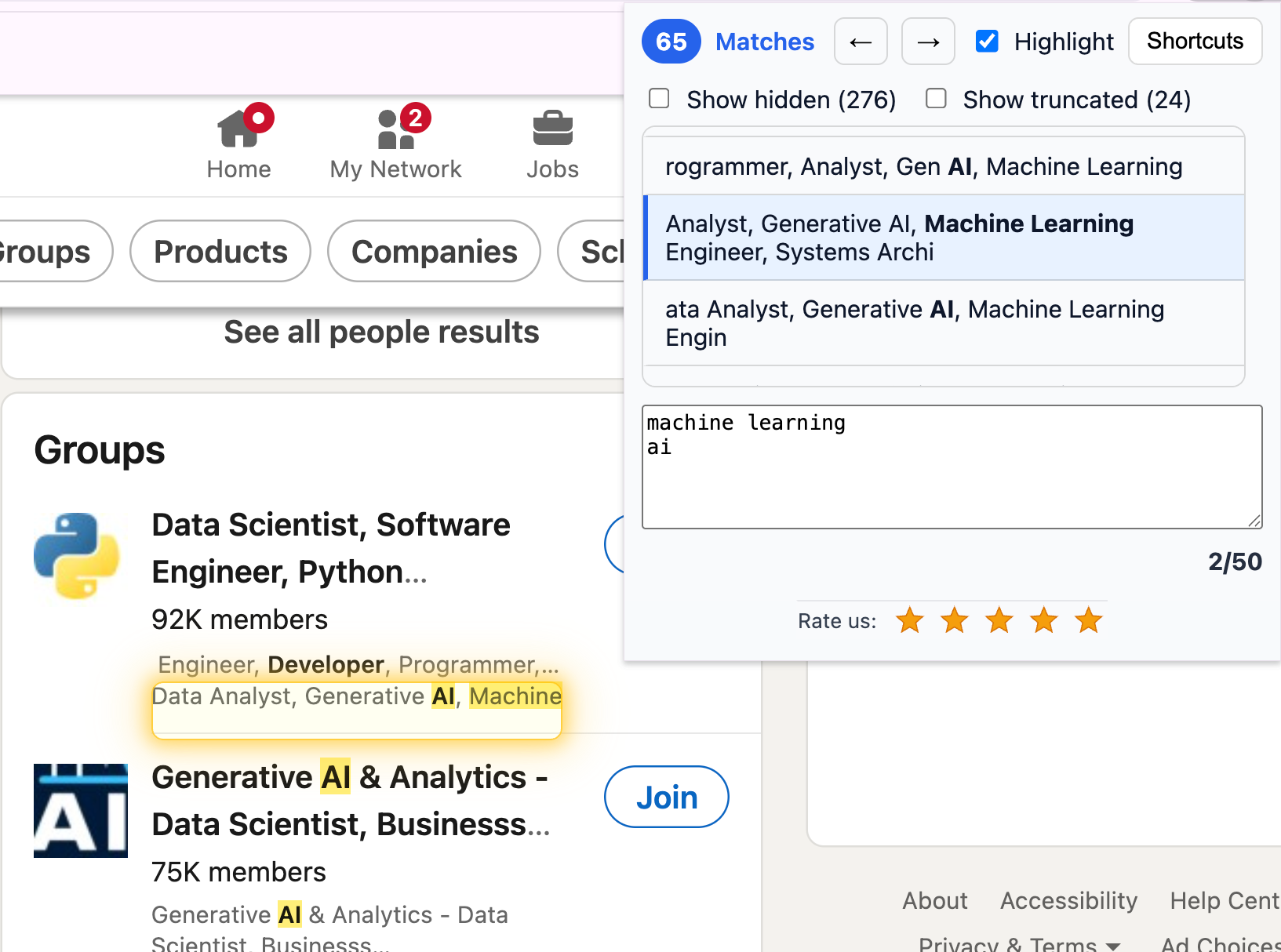 I have just created a Chrome extension that replaces Cmd‑F when you need to search for many terms at once. Think “ERROR”/“WARNING” or “JavaScript”/“Machine Learning”/“AI”.